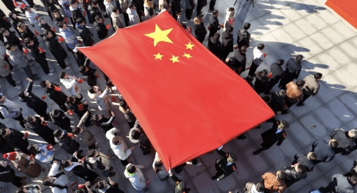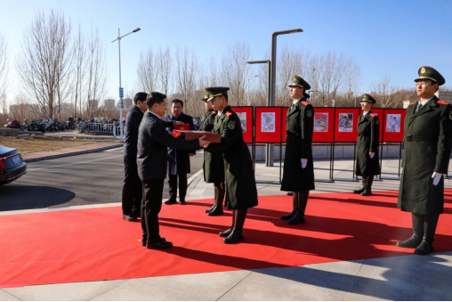 Secretary Zhao Xianfeng and President Zhao Dingxuan present the national flag and the flag presentation certificate to the flag bearer of the flag-guard team