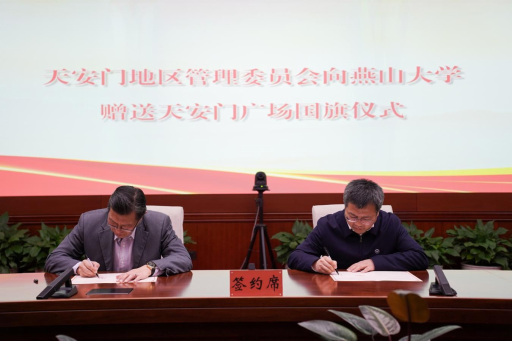 On the afternoon of December 13, the flag presentation ceremony took place in Beijing. Yao Hui, Member of the CPC Leadership Group and Deputy Director of the Administration of Tian’anmen Area, presented the special national flag to YSU. Commissioned by Zhao Xianfeng, Secretary of the CPC YSU Committee, and Zhao Dingxuan, YSU President, Cai Xingzhou, Member of the Standing Committee of the CPC YSU Committee and YSU Vice President, received the flag on behalf of faculty and students of YSU. Guests attending the ceremony included Wang Yanrong, Director of the Management Office of Tian’anmen Square under the Administration, An Bukai, Director of the Comprehensive Management and Service Center under the Administration, and Xue Chuanjia, Director of the Department of Student Affairs of the CPC YSU Committee.