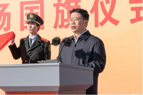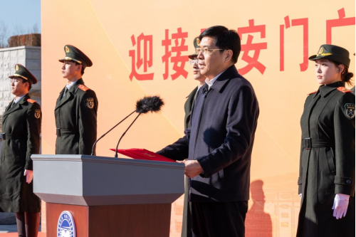 Vice President Cai Xingzhou escorted the national flag to the ceremony. Secretary Zhao Xianfeng and President Zhao Dingxuan carefully presented a camphor chest containing the national flag and the flag presentation certificate to the flag bearer of the flag-guard team.
